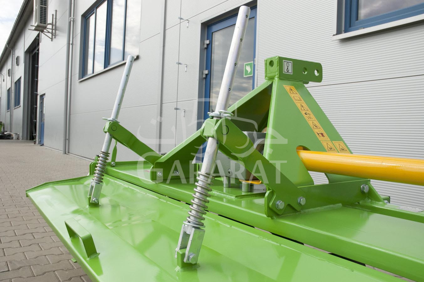 The machine is equipped with a traditional rear protective cover that limits the release of soil and stones. Raising the cover reduces soil fragmentation, and lowering it increases the fragmentation as a result of the impact of soil particles on the cover.