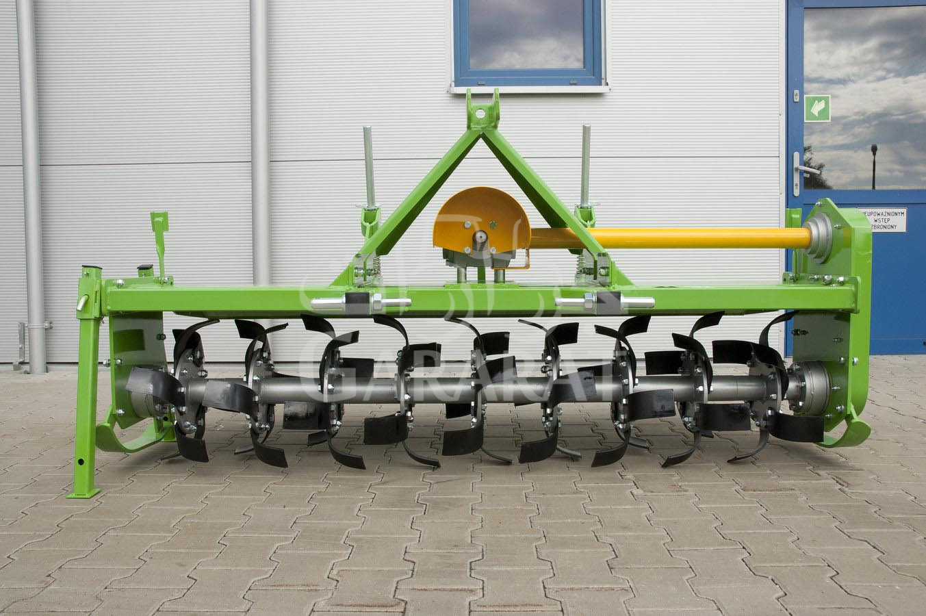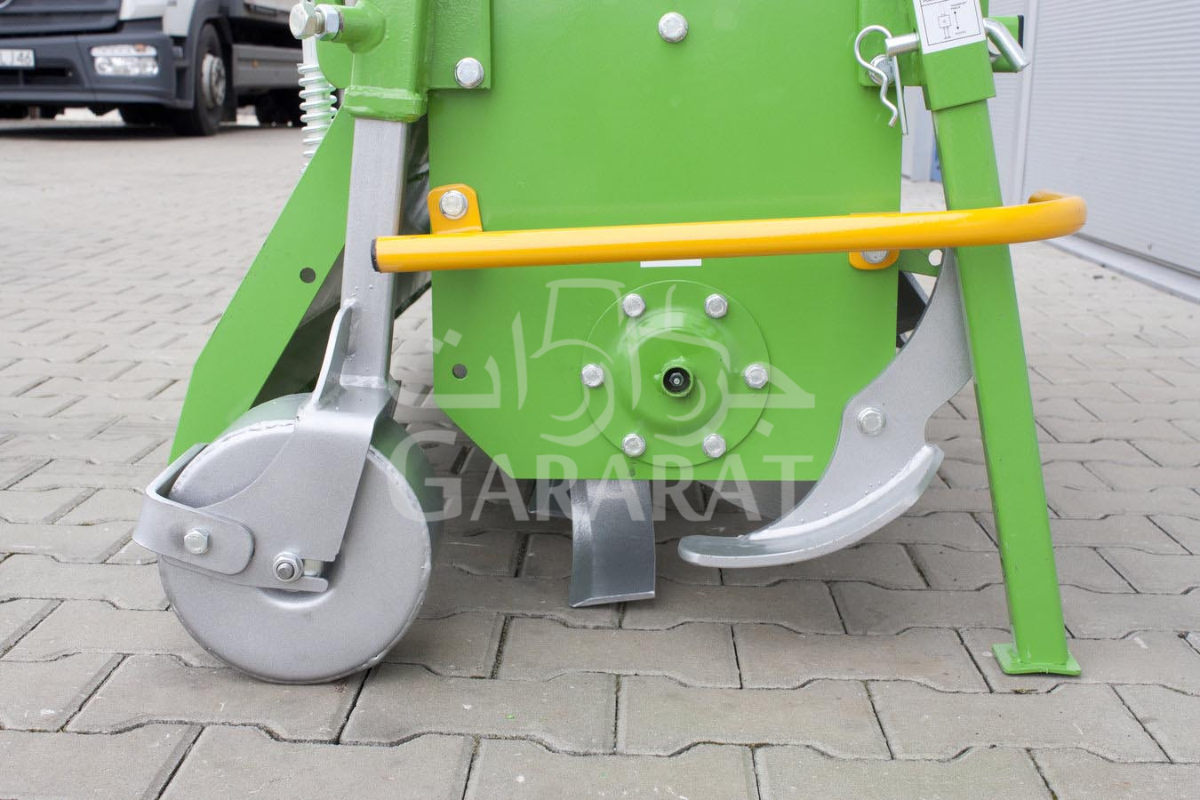The machine is equipped with a traditional rear protective cover that limits the release of soil and stones. Raising the cover reduces soil fragmentation, and lowering it increases the fragmentation as a result of the impact of soil particles on the cover.