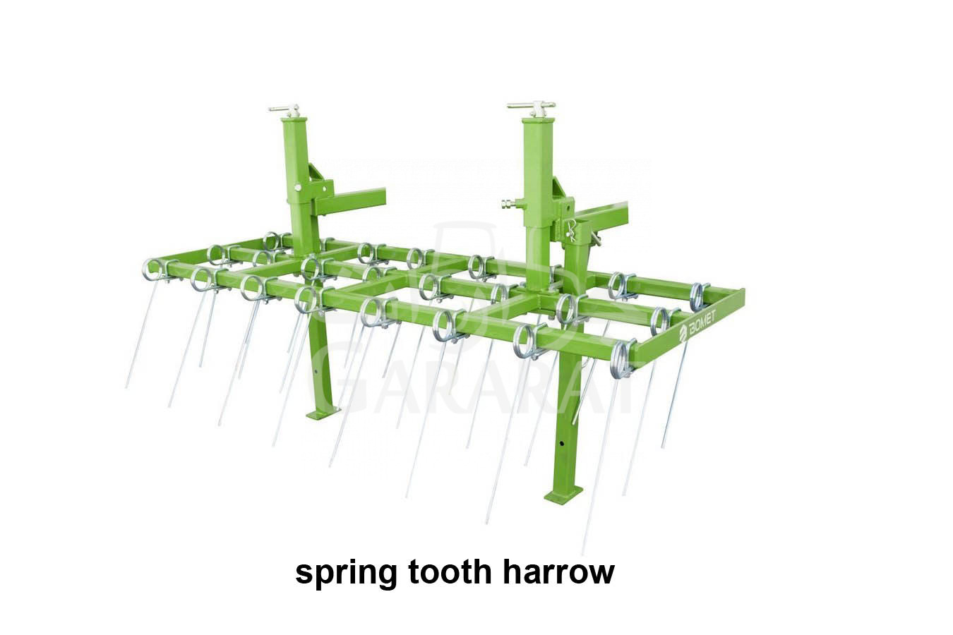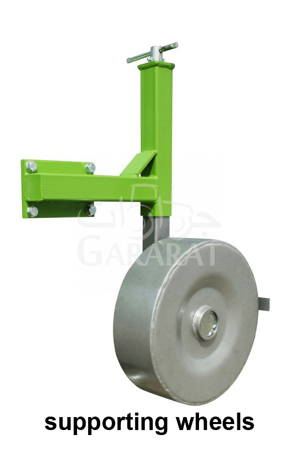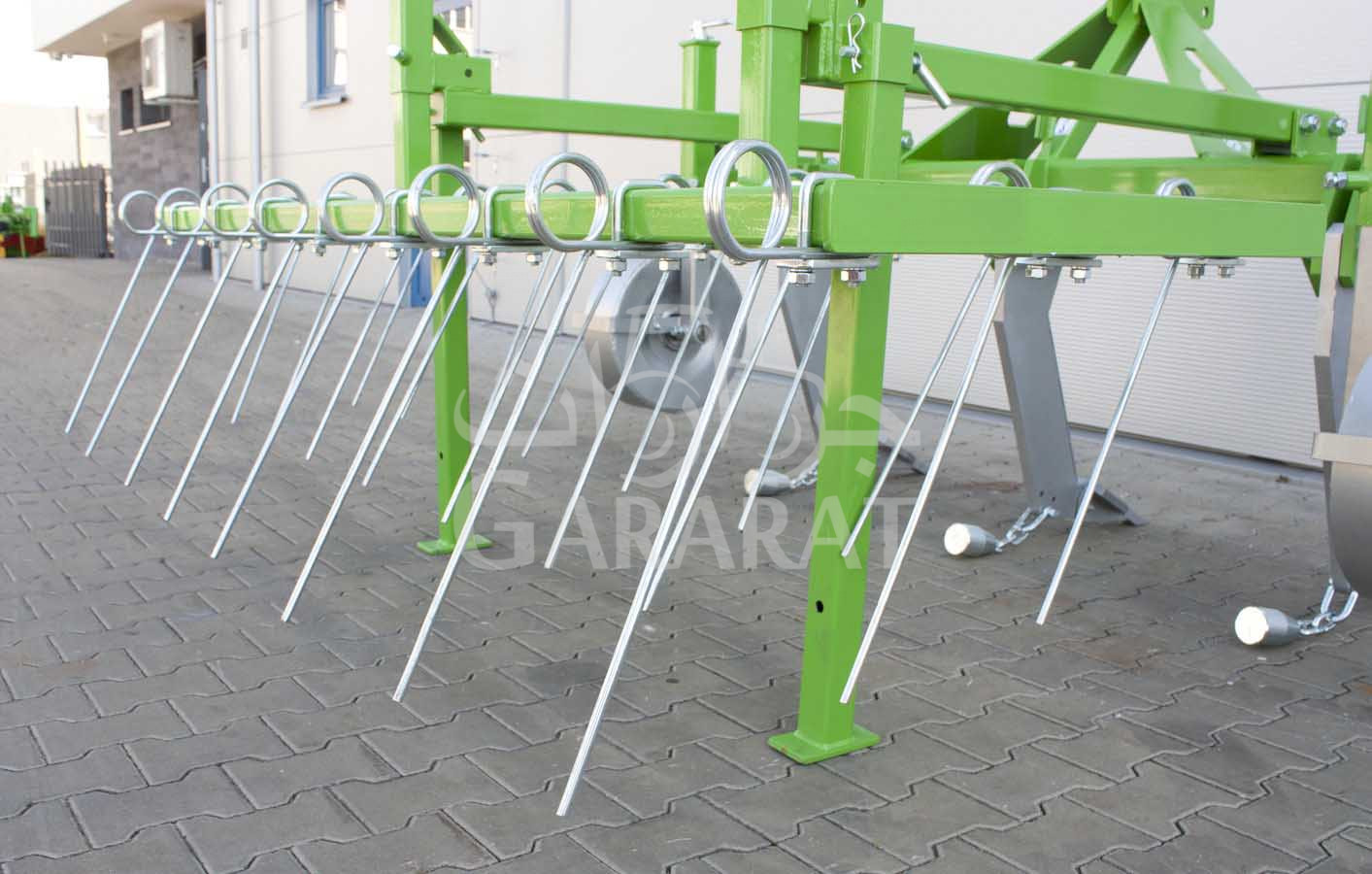 The machine can be equipped additionally with support wheels and spring tooth harrow. Support wheels are used to determine the working depth of the machine. Spring tooth harrow cooperating with it rakes and levels the surface of uplifted soil, which limits the evaporation of water from the soil and accelerates the emergence of seeds sown during harvesting.