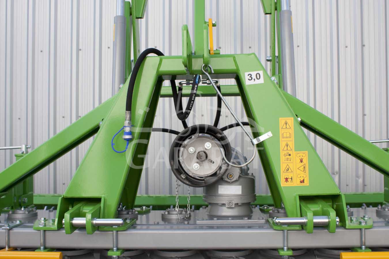 The power harrow is equipped with PTO shaft, leveling board, and hydraulic coupler (two hydraulic cylinders) as a standard.